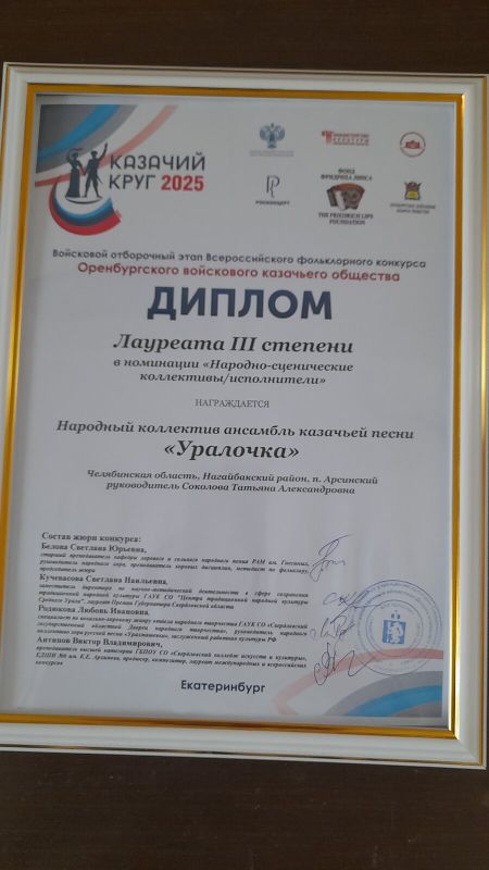 😀26-27 сентября наш коллектив "Уралочка" принял участие во Всероссийском фестивале "Казачий круг" в г. Екатеринбурге. В фестивале участвовали коллективы из Башкирии, Оренбургской об, Курганской, Свердловской и Челябинской областей. Наш Народный коллектив ансамбль казачьей песни "Уралочка" достойно представил Нагайбакский район и стал обладателем Диплома Лауреата III степени.