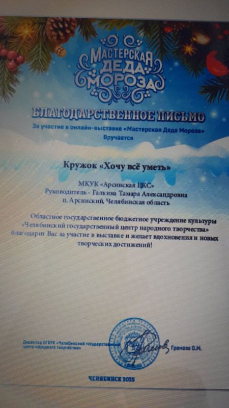 Наши поделки на Областной онлайн выставке Грани творчества ОГБУ ОЦНТ "Мастерская деда Мороза" оценили во достоинству. Всем участникам выставки были разосланы Благодарственные письма. (руководитель Галкина Тамара Александровна)