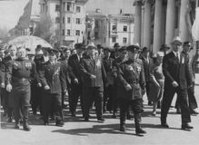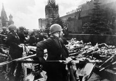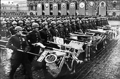 Через несколько минут после завершения парада на Москворецкой показываются первые колонны. Впереди — военнослужащие со штандартами фронтов Красной Армии. "С Победой!" — кричат они толпе. В ответ сотни людей скандируют: "Ура!" Каждая группа проходит под мостом со своей песней: "Едут-едут по Берлину наши казаки", "День Победы", "Эх, Ладога, родная Ладога". Знакомые слова тут же подхватывают и на мосту.